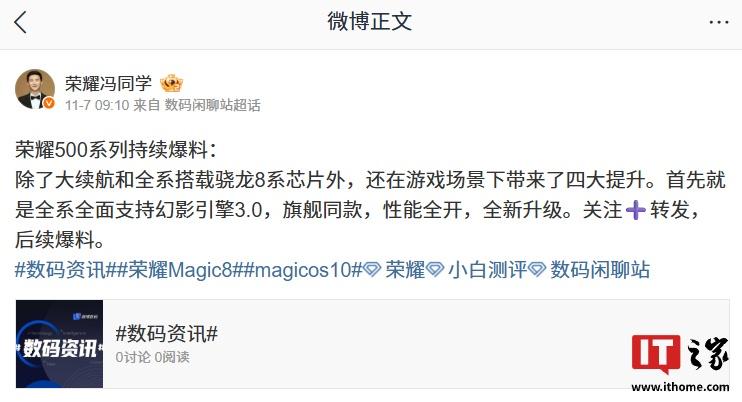 荣耀游戏研发工程师 @荣耀冯同学 在 11 月 7 日发布了数字 500 系列手机“爆料”,称新机除了大续航和全系搭载骁龙 8 系芯片外,还在游戏场景下带来了四大提升。首先就是全系全面支持幻影引擎 3.0,旗舰同款。