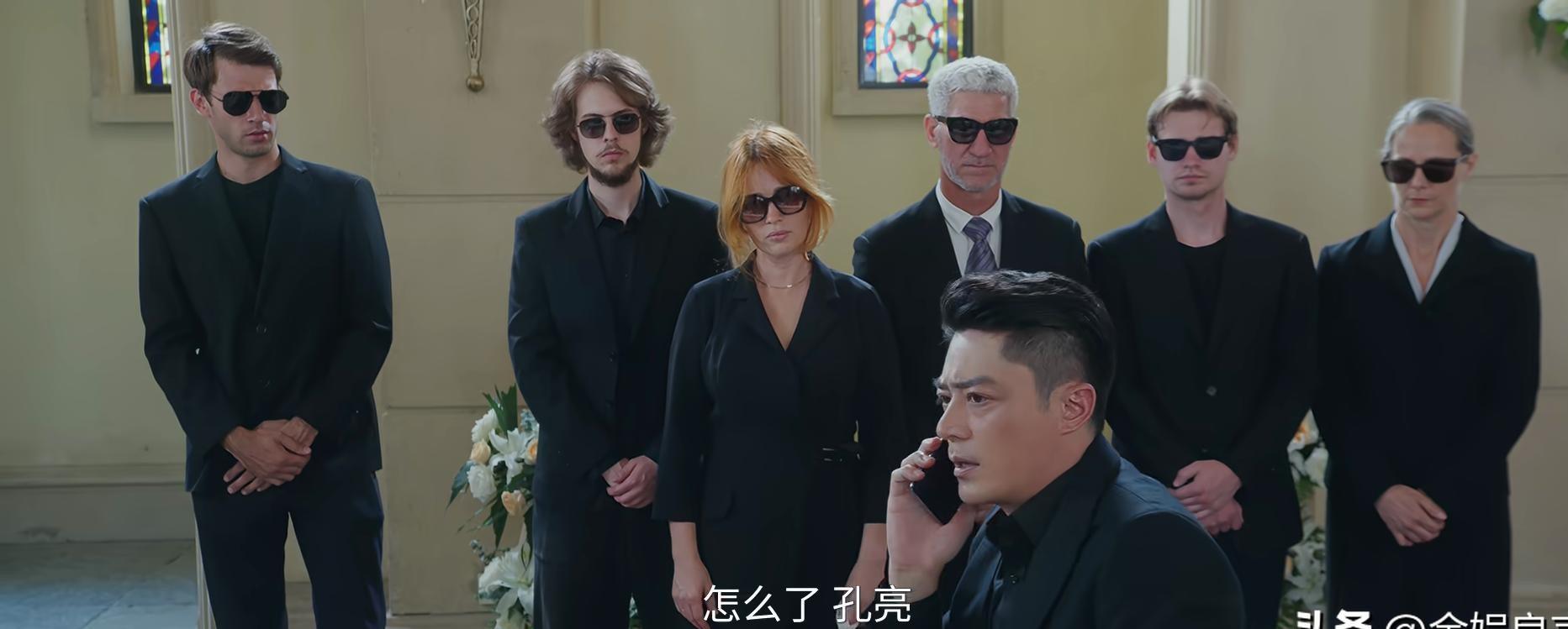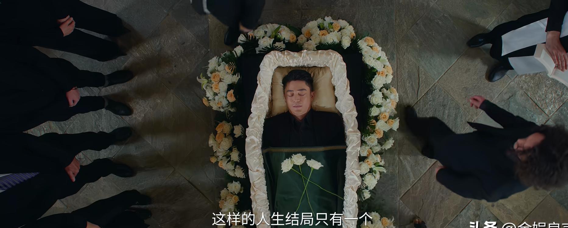 而葬礼的主人公不是别人,正是霍建华本人,他正躺在棺材中间安详地紧闭双眼。